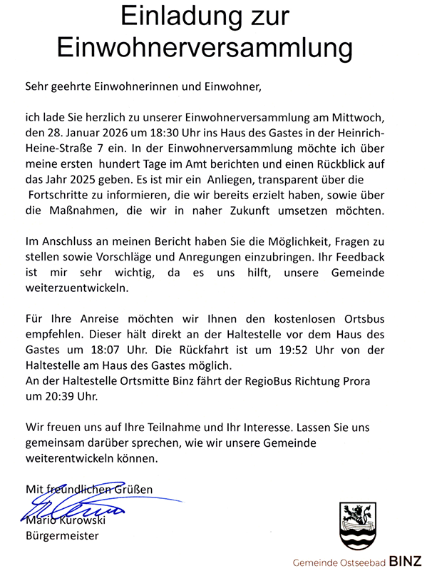 Einladung des Bürgermeisters zur Einwohnerversammlung in Binz